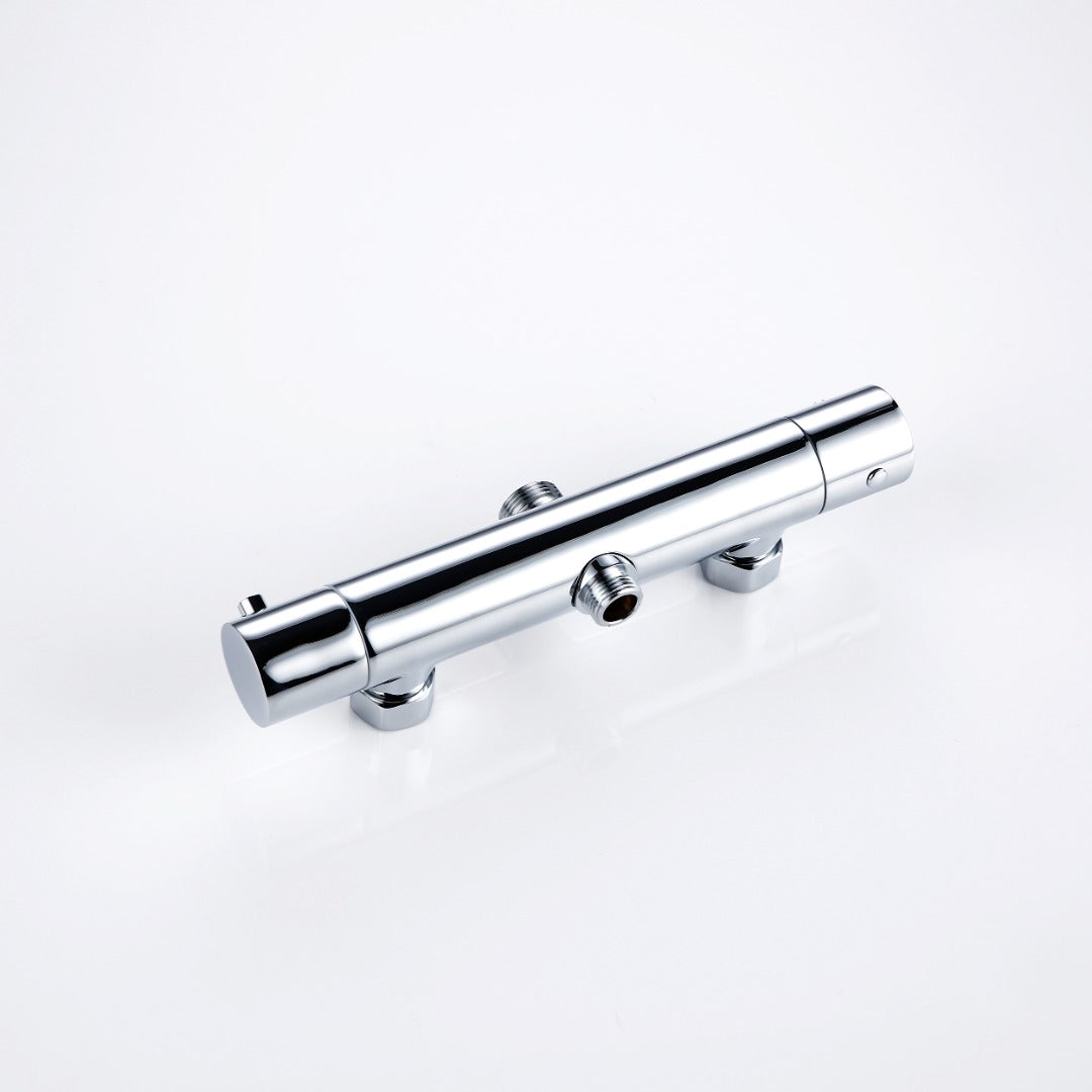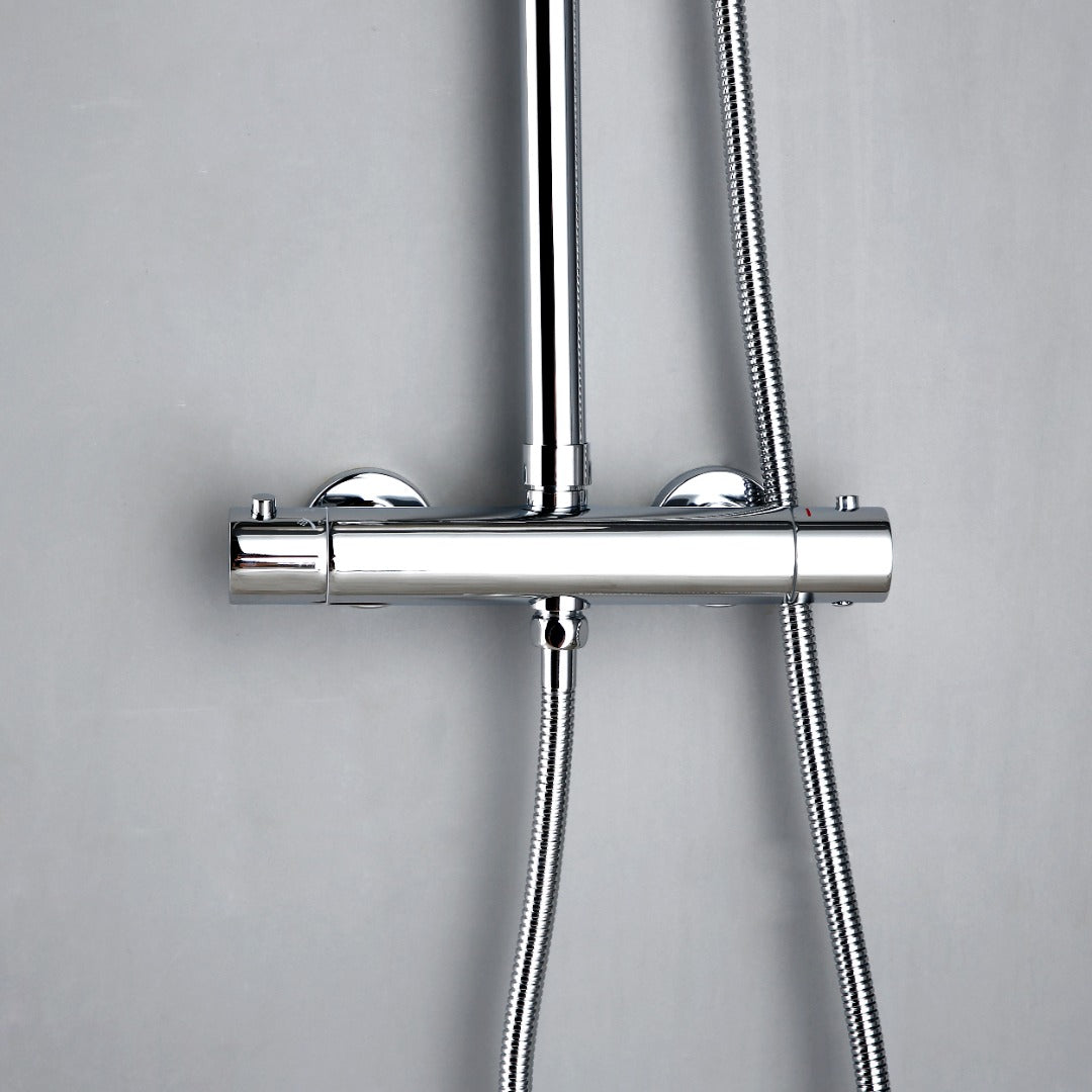 Cette colonne de douche thermostatique en finition chrome est pourvue d'une douchette à main au design épuré et un ciel de douche rond extra plat. Le tout dans des matériaux massifs garanties sans oxydation : le laiton et l'alliage d'acier inoxydable.