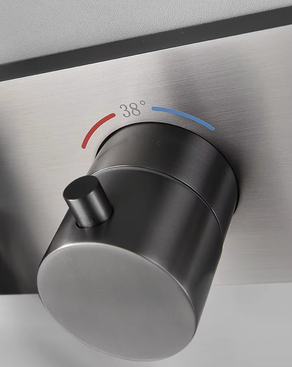 Colonne de bain et de douche thermostatique en finition gris brossé, équipée d'une douchette à main au design épuré et d'un bec verseur pour baignoire extra plat. Ce bec verseur est indépendant du reste des poignées de commande, ce qui vous laissera libre choix de la positionner à l'endroit idéal pour votre installation. Il sert également de tablette pour votre savon.