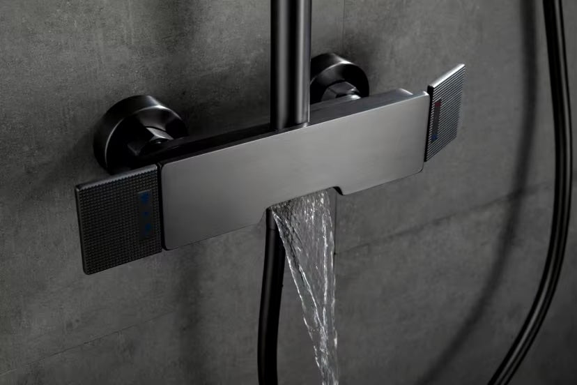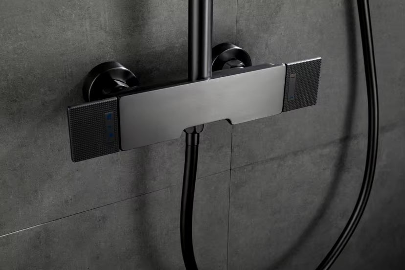 Colonne de douche en finition gris brossé, équipée d'une douchette à main et d'un ciel de douche rectangulaires. Également pourvue d’un bec verseur, elle sera idéale au dessus de votre baignoire.