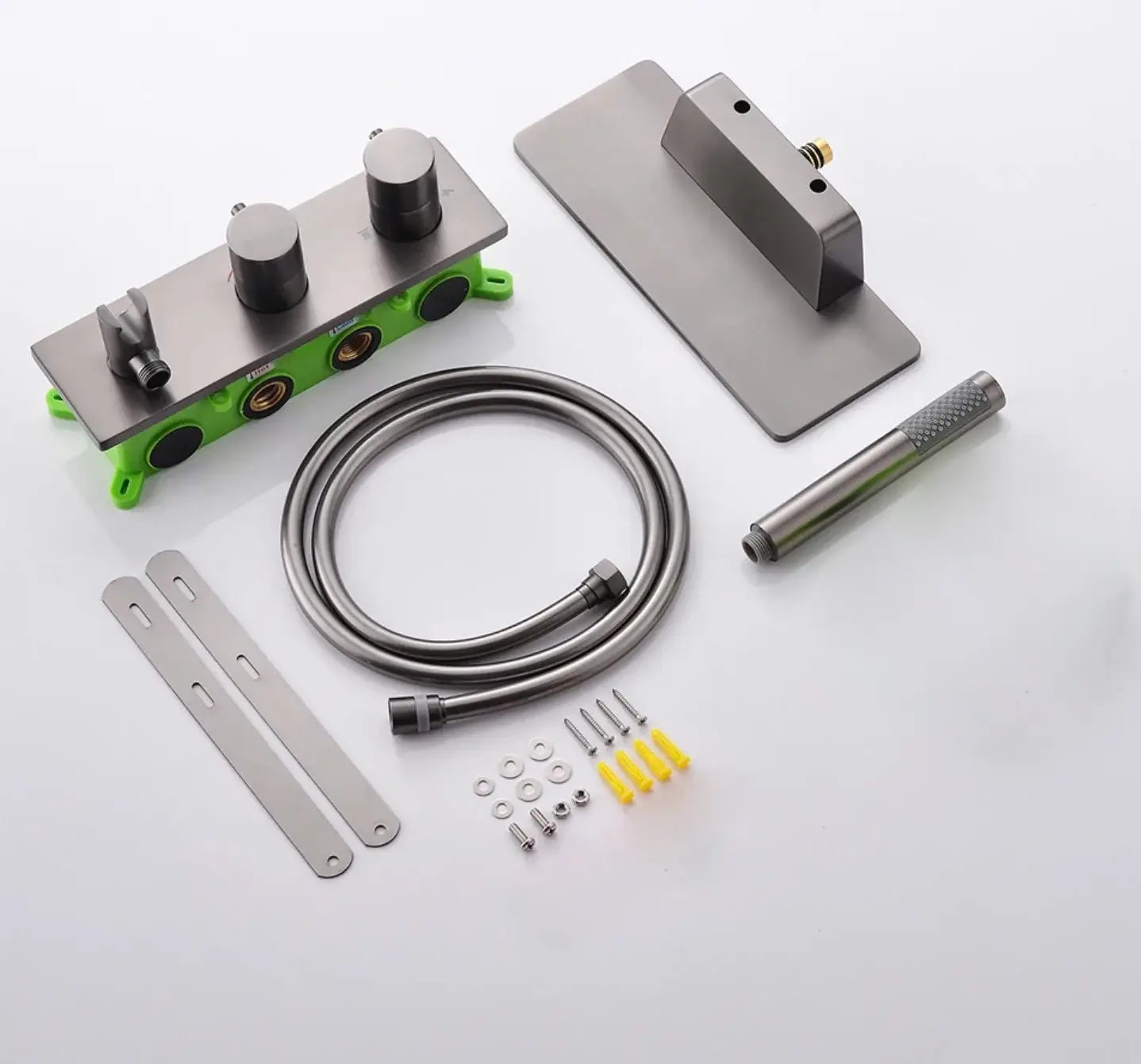 Mitigeur de bain thermostatique en finition gris brossé, équipé d'une douchette à main au design épuré et d'un bec verseur pour baignoire. Ce bec verseur est indépendant du reste des poignées de commande, ce qui vous laissera libre choix de la positionner à l'endroit idéal pour votre installation. Il sert également de support pour votre savon.
