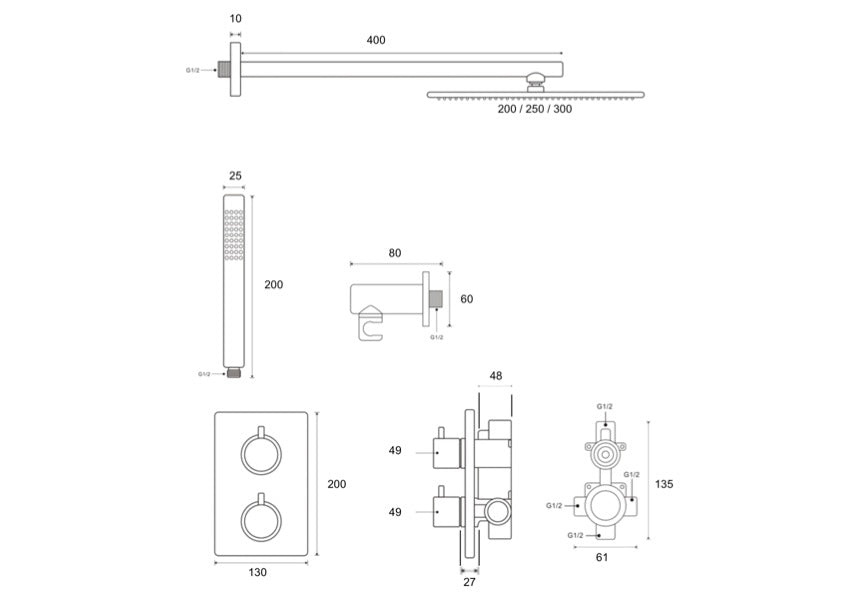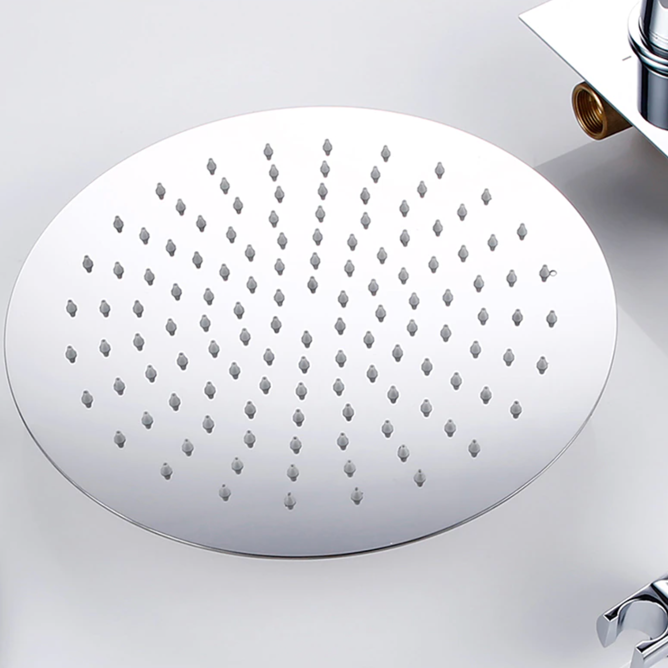 Ensemble de douche thermostatique en finition chrome, équipé d'un ciel de douche disponible dans différents diamètres et d'une douchette à main au design épuré.