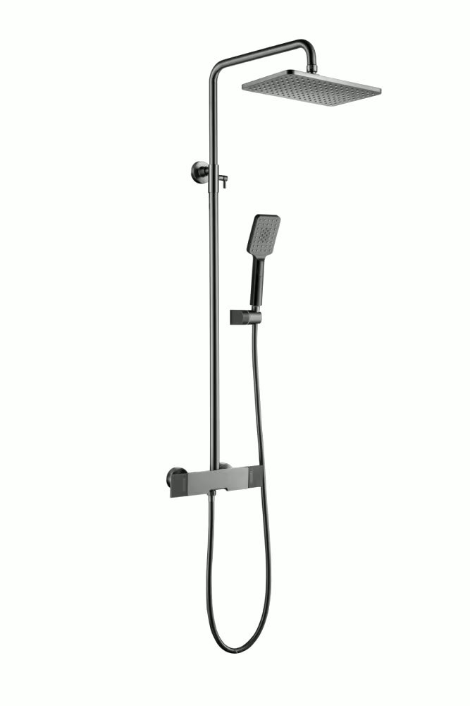 Colonne de douche en finition gris brossé, équipée d'une douchette à main et d'un ciel de douche rectangulaires. Également pourvue d’un bec verseur, elle sera idéale au dessus de votre baignoire.
