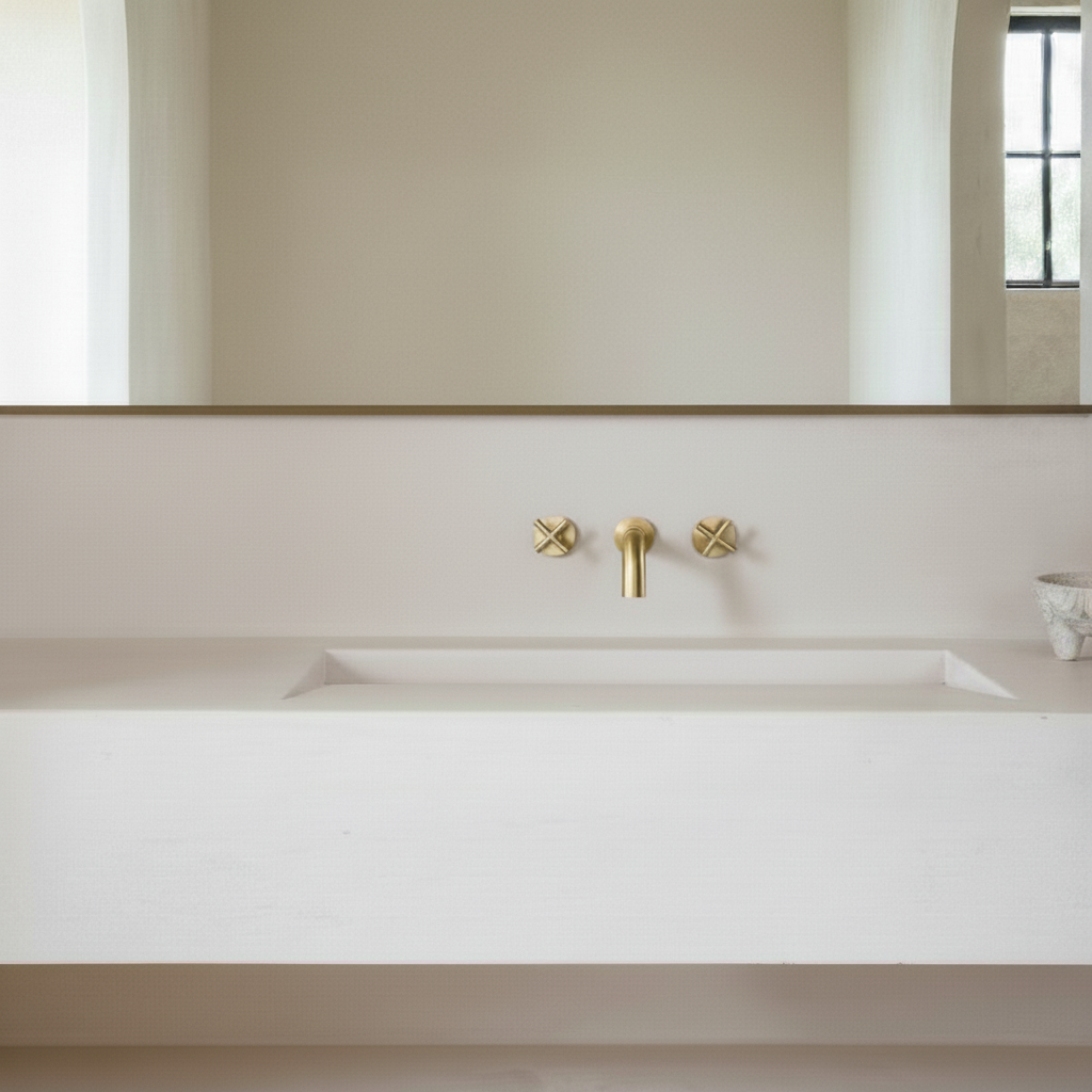 Doté de deux poignées croisées pour un contrôle précis de la température et du débit, ce robinet est idéal pour les vasques encastrées ou les plans de toilette en béton, marbre ou céramique.