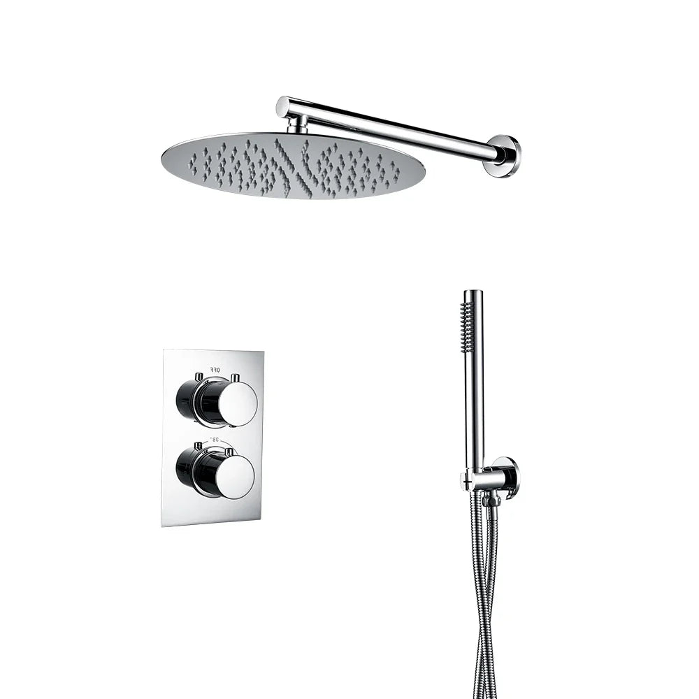 Ensemble de douche thermostatique en finition chrome, équipé d'un ciel de douche disponible dans différents diamètres et d'une douchette à main au design épuré.