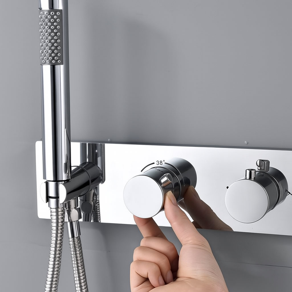 Colonne de douche thermostatique en finition chrome, équipée d'une douchette à main au design épuré et d'un ciel de pluie orientable.