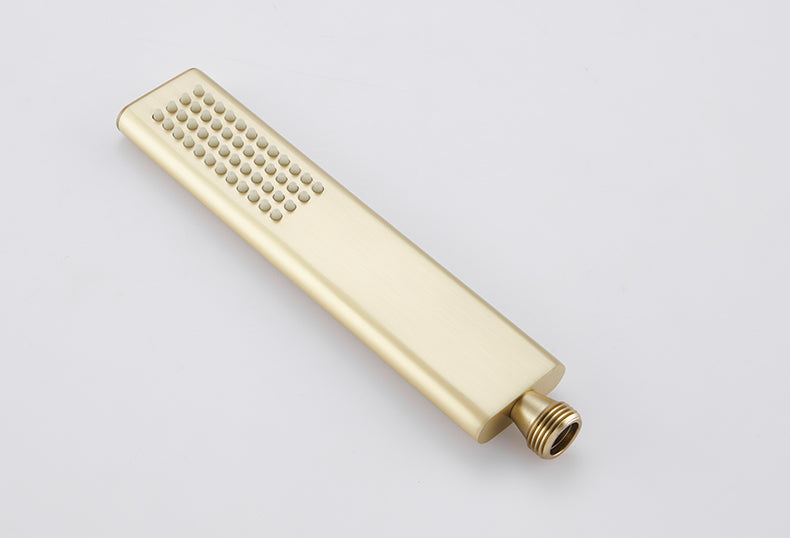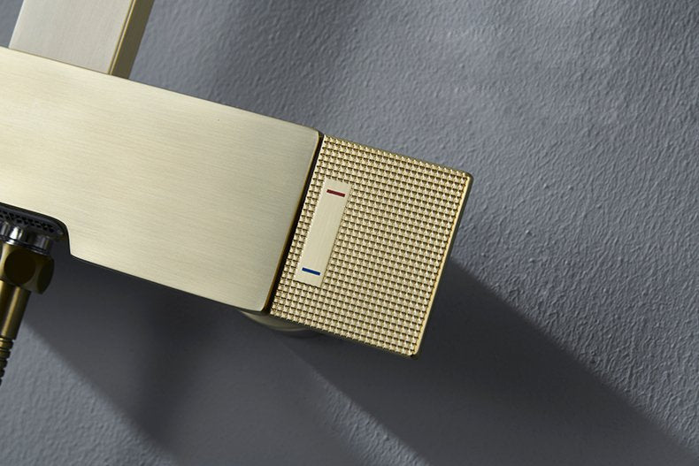 Colonne de douche en finition or brossé, équipée d'une douchette à main et d'un ciel de douche rectangulaires. Également pourvue d’un bec verseur, elle sera idéale au dessus de votre baignoire. Il est conseillé de positionner son mitigeur à une hauteur standard de douche de 110 cm par rapport au sol. Elle est constituée de laiton et d'alliage d'acier inoxydable pour une durabilité exemplaire.